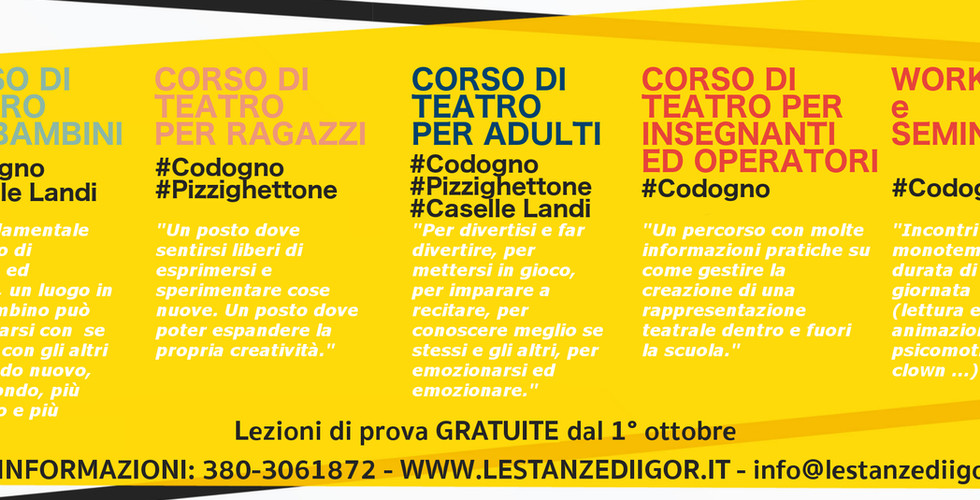 Ripartono come ogni anno le proposte laboratoriali delle Stanze di Igor, quest'anno, grazie anche alla collaborazione con diverse realtà del territorio lodigiano, proporremo corsi rivolti a BAMBINI, RAGAZZI ed ADULTI.